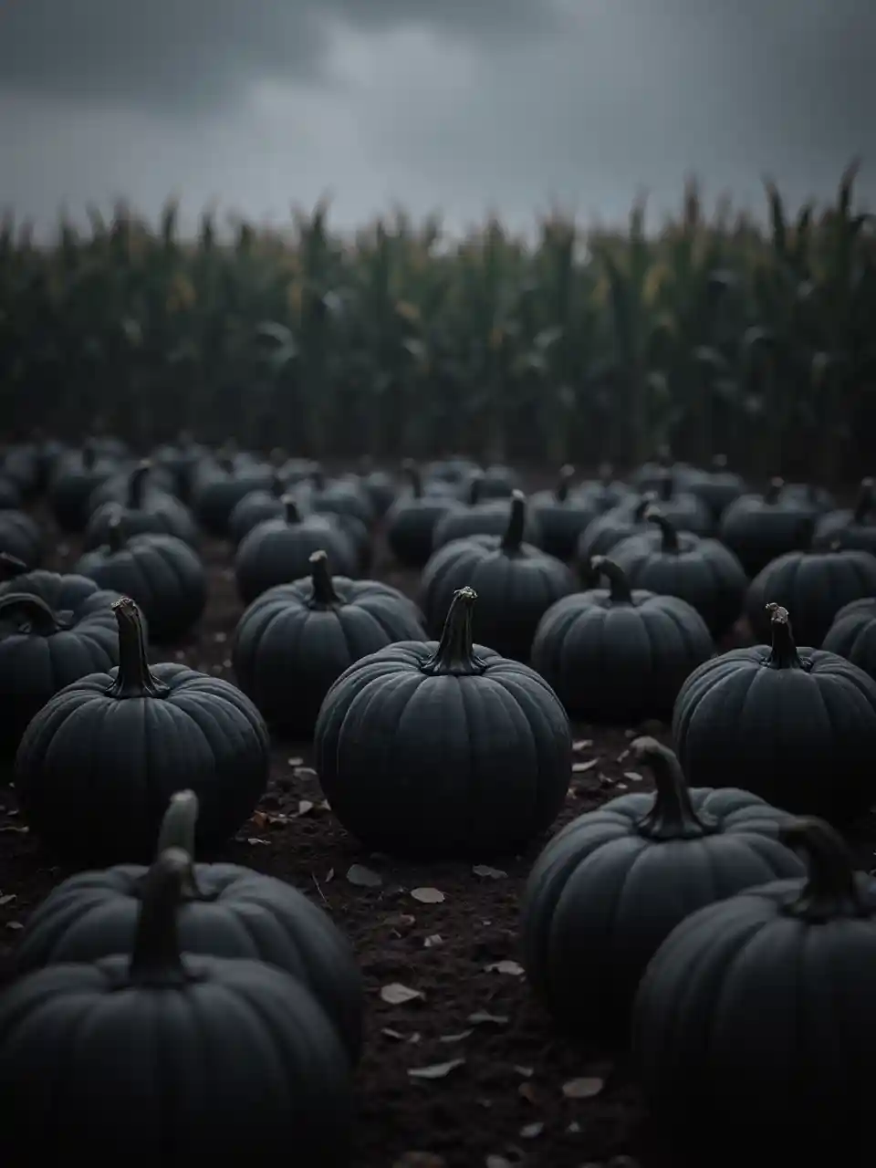 GraceMatango meusi katika shamba jeusi ya kutisha na mawingu ya giza na ukungu 8k Uhalisi Nuru 50 za jack-o-lantern bila malenge ya mwanga kwenye shamba lenye mahindi Ongeza kina cha uwanja katika picha