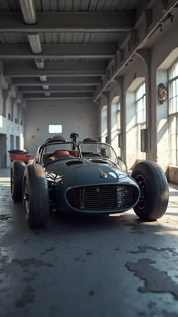 3D illustration ya gari la mbio la kisasa katika karakana ya zamani