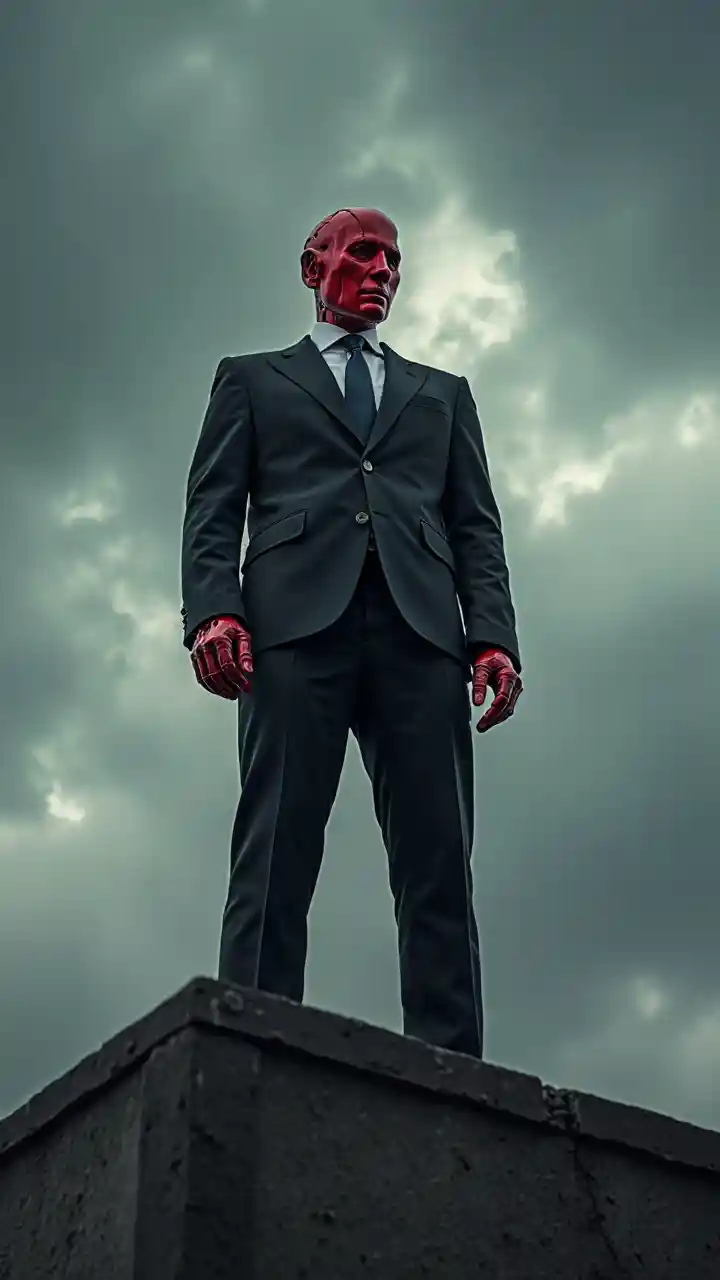 mtu katika suti nyeusi, nyekundu kichwa roboti kusimama juu ya jengo, na mawingu ya giza mbinguni