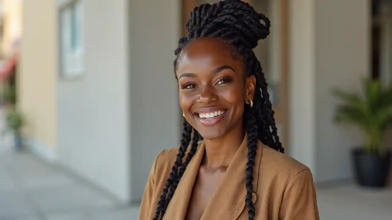 mwanamke mweusi mwenye tabasamu na viatu vya Kiafrika.