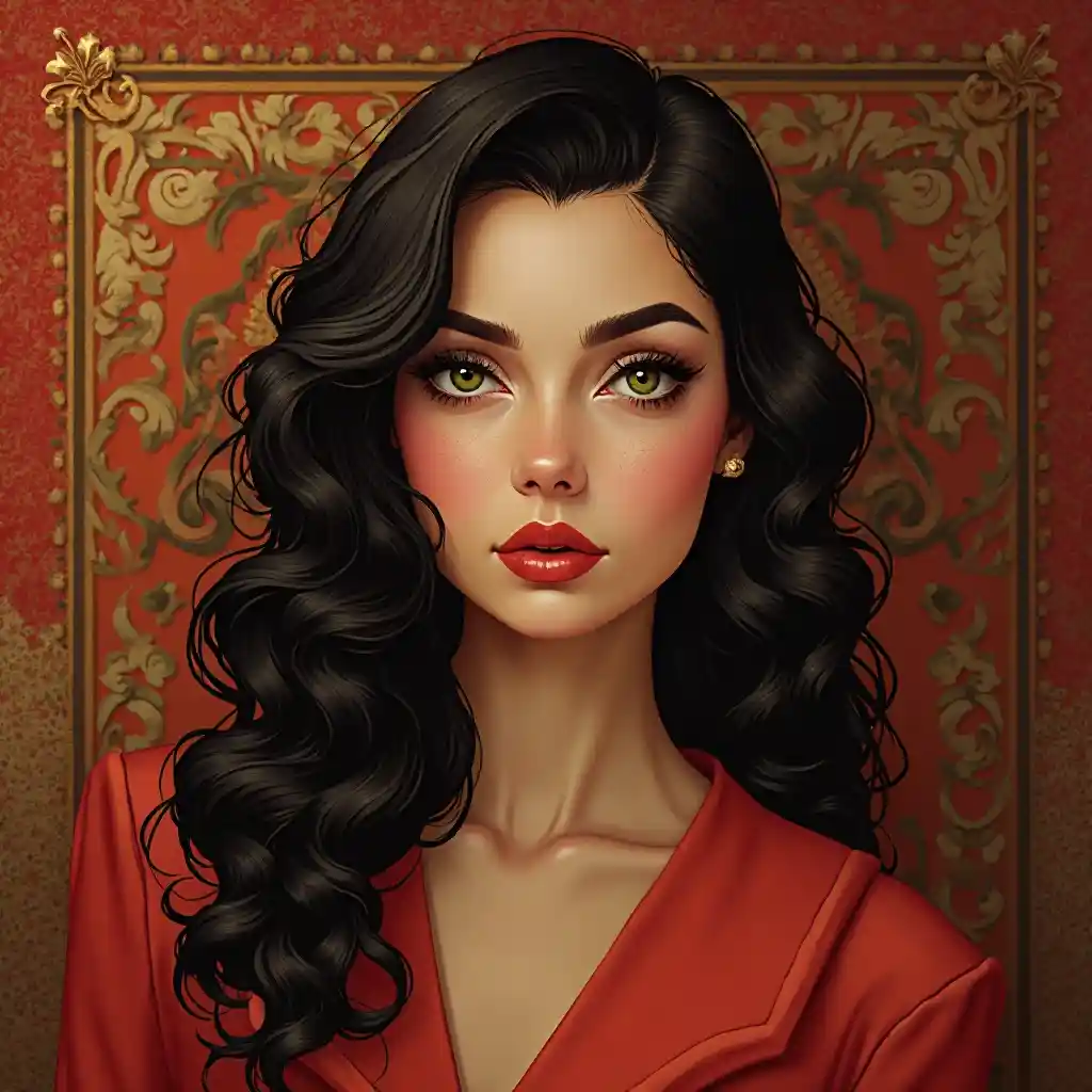 Mwanamke nywele kubwa, macho makubwa ya kijani, nywele nyekundu, mdomo rangi nyekundu , fondo de estampado art de