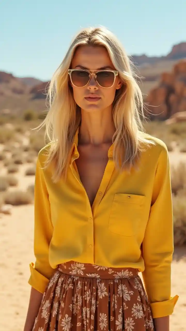 Mwanamke blonde amevaa shati ya manjano na sketi ya rangi ya kahawia na miwani ya wazi mbele ya jangwa, iliyoundwa na Michael Kors.