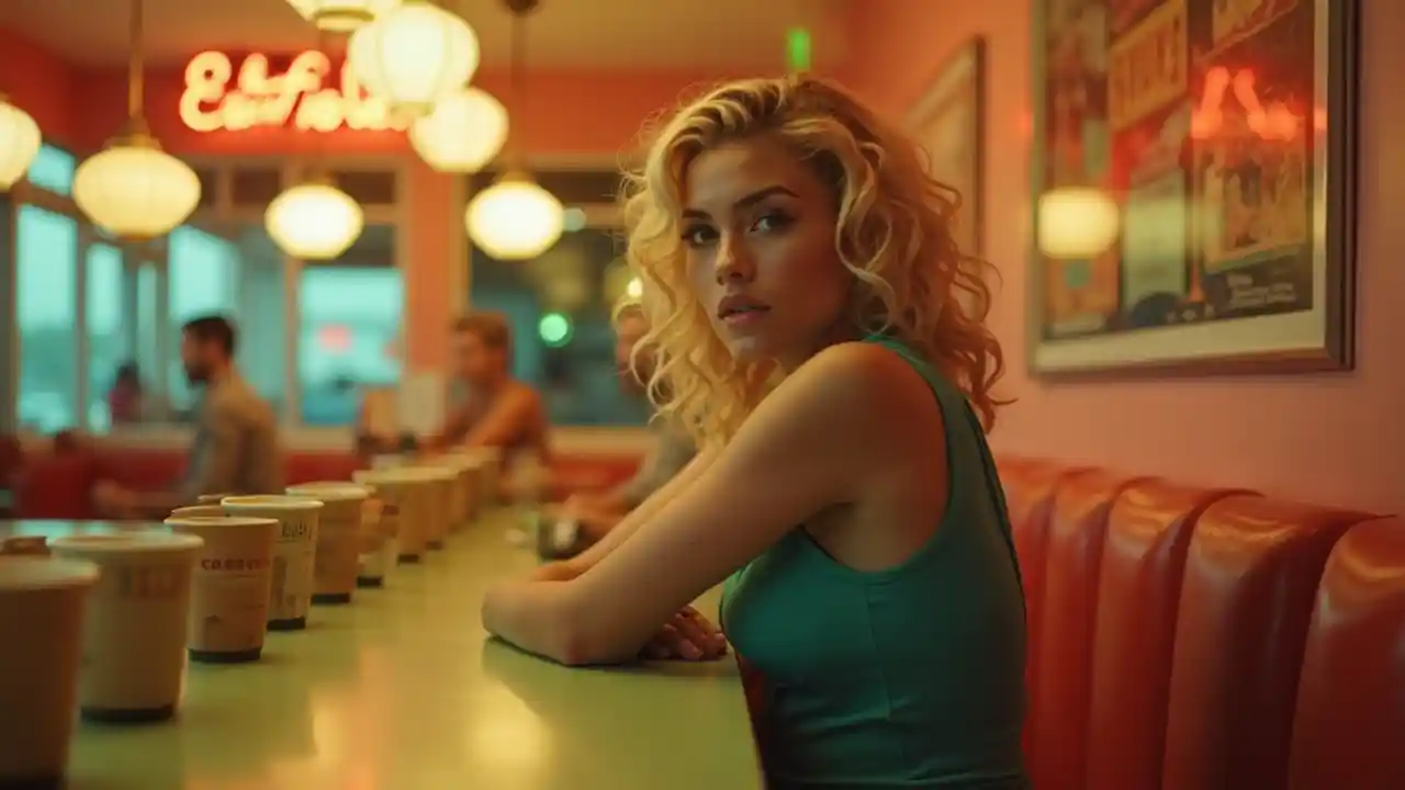 Mwanamke mwenye nywele nyeupe, zenye kupindukia na sura nzito ameketi kwenye kaunta katika mgahawa wa dining, kwa mtindo wa Edward Hopper. Anavaa vazi la rangi ya kijani, lisilo na mikono, ambalo huonyesha sehemu ya juu ya mwili wake. Mikono yake imefungwa, na inategemea meza ya rangi ya kijani. Chumba cha kulia chakula kina taa zenye joto, rangi ya manjano na rangi ya rangi ya nyekundu, na hivyo kuunda aesthetic ya zamani. Taa za kunyongwa na ishara za neon zenye rangi kama nyekundu, kijani na machungwa huongeza hisia za nyuma. Vikombe kadhaa vya karatasi vinaonekana kwenye meza. Kuta zake zina rangi ya waridi-mwaridi na zimepambwa kwa mabango ya zamani. Maelezo ya nyuma yanaonyesha wageni wengine na kibanda katika mgahawa. Mwangaza na rangi huchangia hali ya kusisimua.