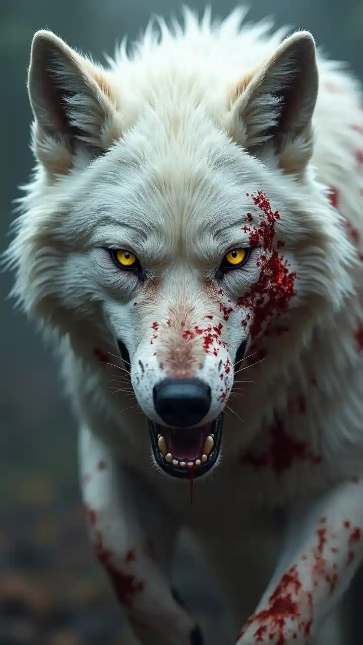 Mbwa-mwitu mweupe mwenye macho ya manjano. Ngozi yake nyeupe imefunikwa na damu.