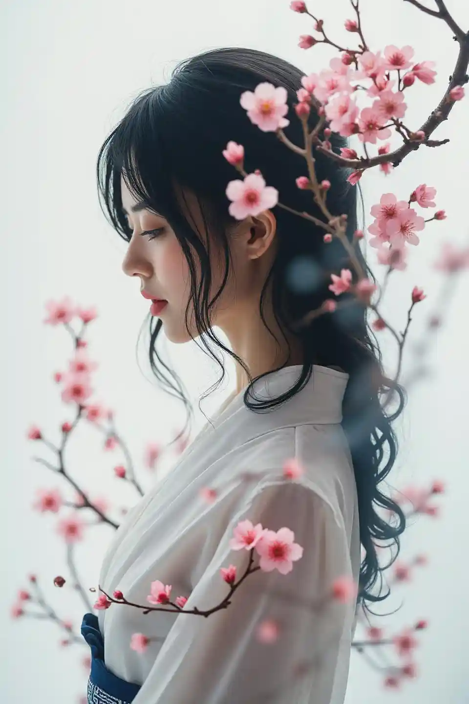 Ufumbuzi mara mbili na picha ya roho ya maua ya cherry、maua ya cherry yanaunganishwa na mwanamke katika kimono safi、macho ya giza, nywele ndefu nyeusi, anatomicall