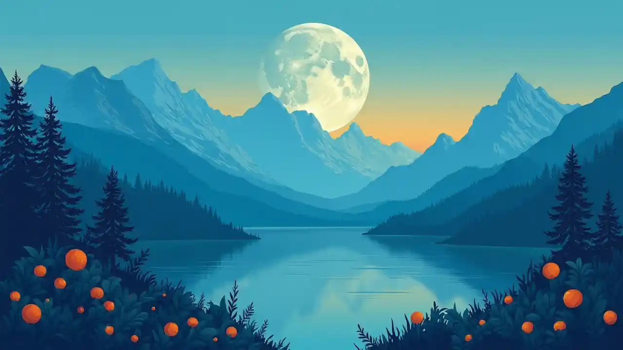Lilysilhouettes bluu ndege, mwezi juu ya safu ya milima, ziwa, miti, bluu, kijani na machungwa, nafasi wazi katikati, matunda machungwa, background bluu