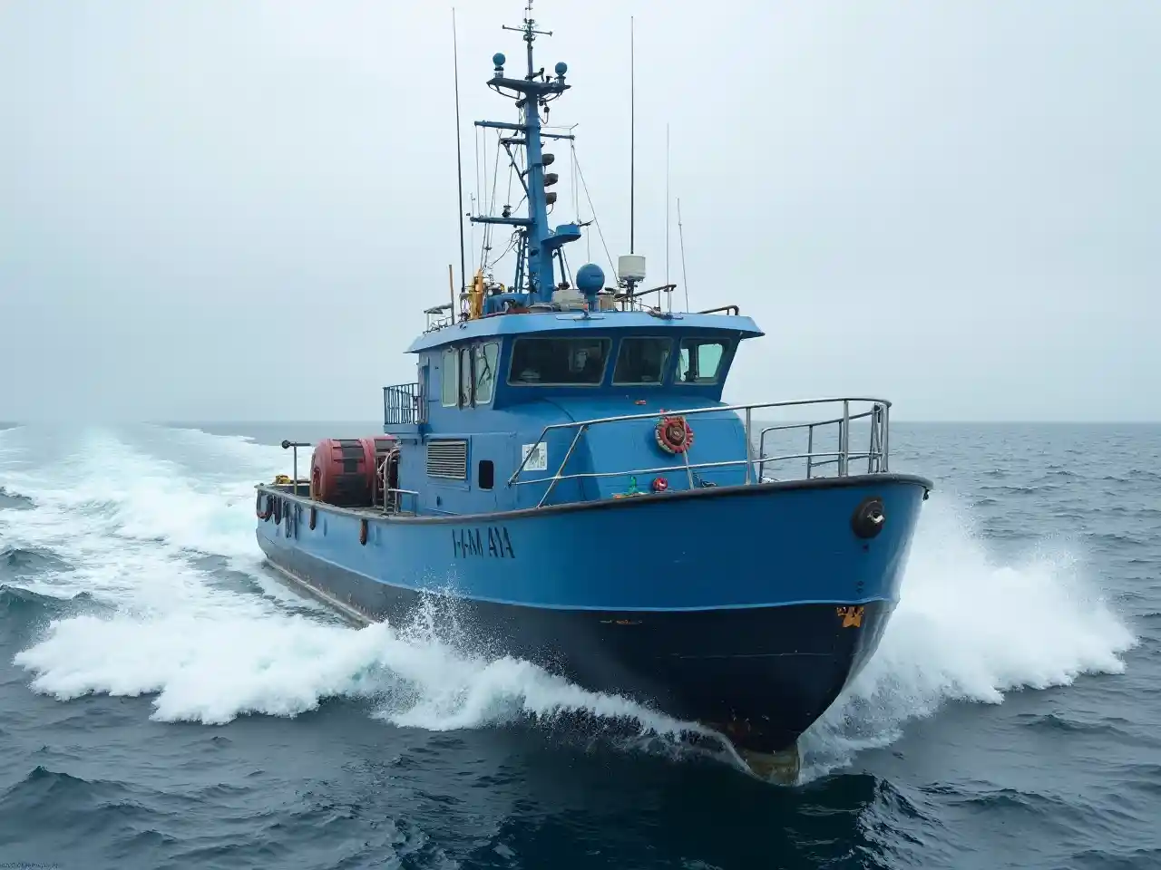 Kiume hii bluu landing craft kuendesha katika bahari vurugu na kufanya mbele ya mashua ramp bow kufanya mashua kama ni mabadiliko snth