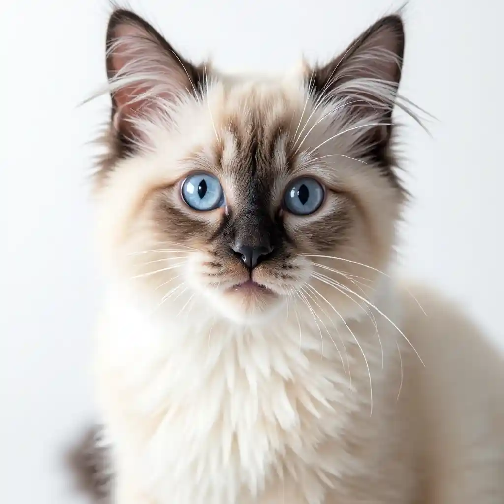 Ragdoll cat with blue eyes looking at the camera. Smiling face. Shot in studio on white background