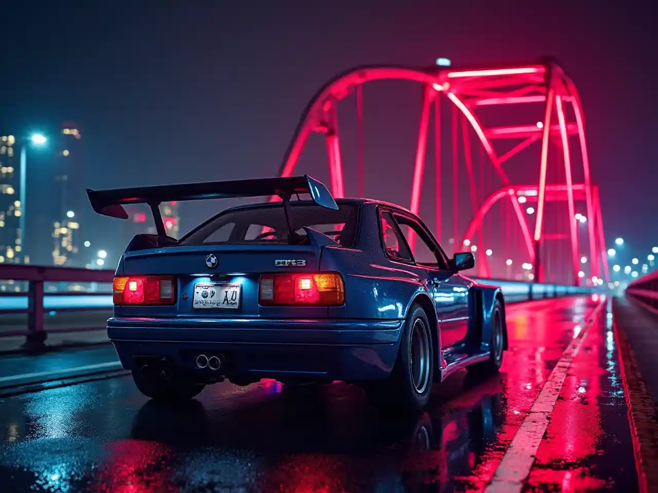 BMW M3 GTR rangi ya zambarau neon mwanga, juu ya daraja