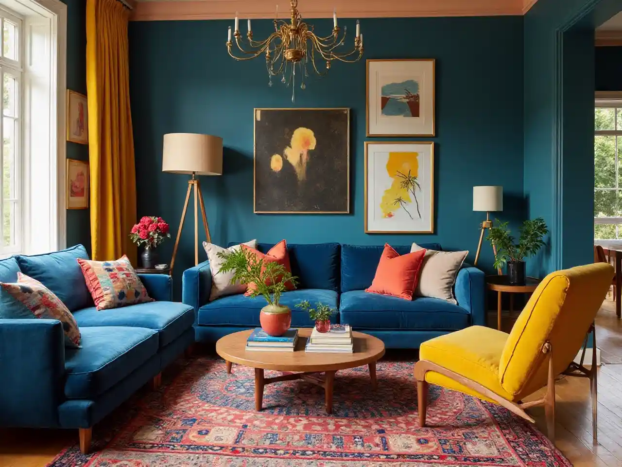 Electic maximalist living room na bold rangi mifumo ya bluu sofa na njano na nyekundu accent kiti