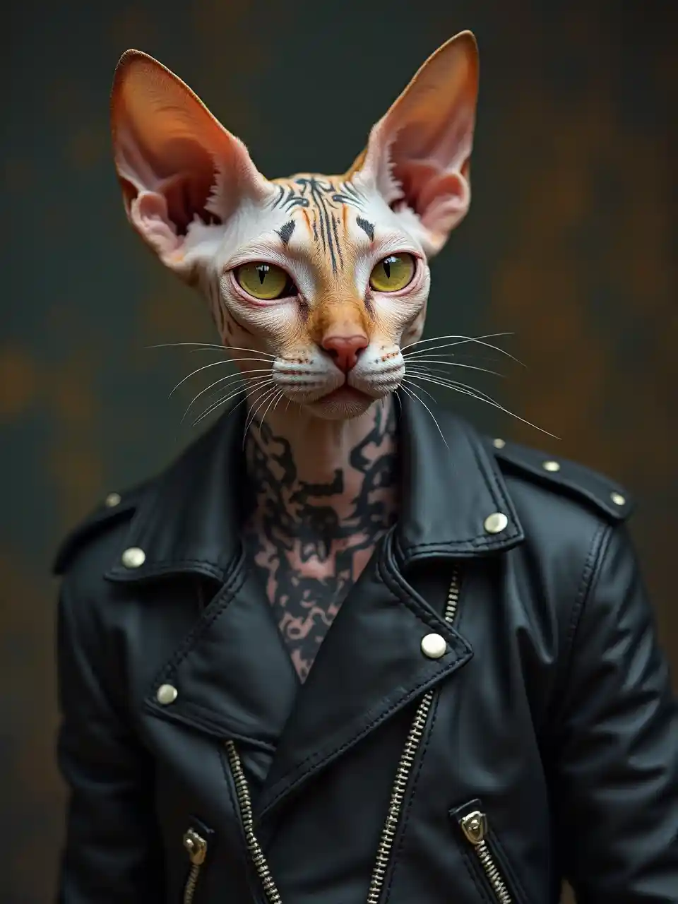 Paka Mzuri wa Sphynx Mwenye Michoro ya Rocker Katika Koti la Baiskeli