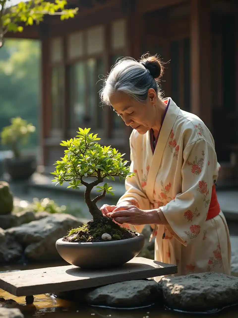 Mwanamke mmoja mwenye umri wa miaka 80 wa Asia Mashariki mwenye nywele za fedha, akiwa na bonsai katika hekalu lenye jua, anavaa kimono kilichopambwa na majani. Taa za mawe na vidimbwi vya samaki hufanyiza sura yake, na nyuso zake zenye upole huonyesha subira na utulivu katika mazingira ya amani na ya kitamaduni. Mikono yake huendeleza usawaziko.