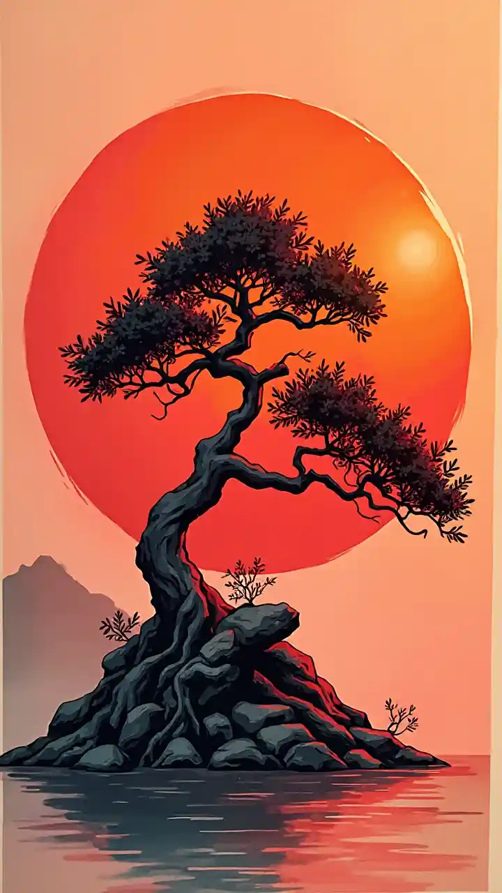 Mti wa bonsai katika mwangaza wa machweo, rangi nyekundu na nyeusi tu, sanaa ya wino