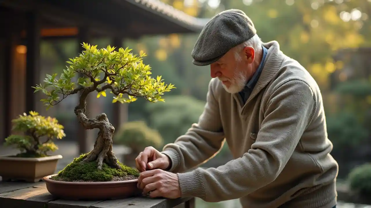 Akiwa akipanda bonsai katika hekalu lenye jua, mwanamume mmoja Mzungu mwenye umri wa miaka 76 aliye na kofia ya sufu amevaa sweta iliyo na vilemba. Taa za mawe na vidimbwi vya samaki humweka ndani ya mandhari, na nyuso zake zenye upole hutoa ishara ya subira na utulivu katika mazingira ya amani na ya kitamaduni. Mikono yake huendeleza usawaziko.