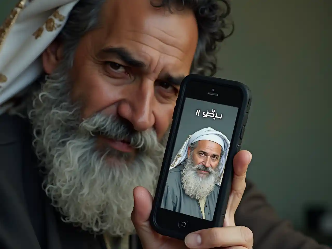 Penelopemwanamume mwenye ndevu nyeupe na picha yake mwenyewe kwa Kiarabu kwenye skrini ya simu ya mkononi na maelezo, Bouchta El Hayani, hurufiyya, uso halisi, picha ya hisa