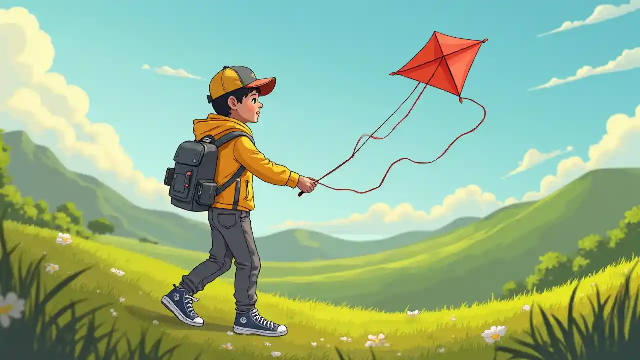 Mvulana wa Mashariki ya Kati mwenye umri wa miaka 10 akiwa na kofia, na viatu vya michezo, anachora ndege wa baharini. Ndege-mvua wanaopuka na vilima vyenye kijani-kibichi humweka katika mazingira yenye msisimuko.
