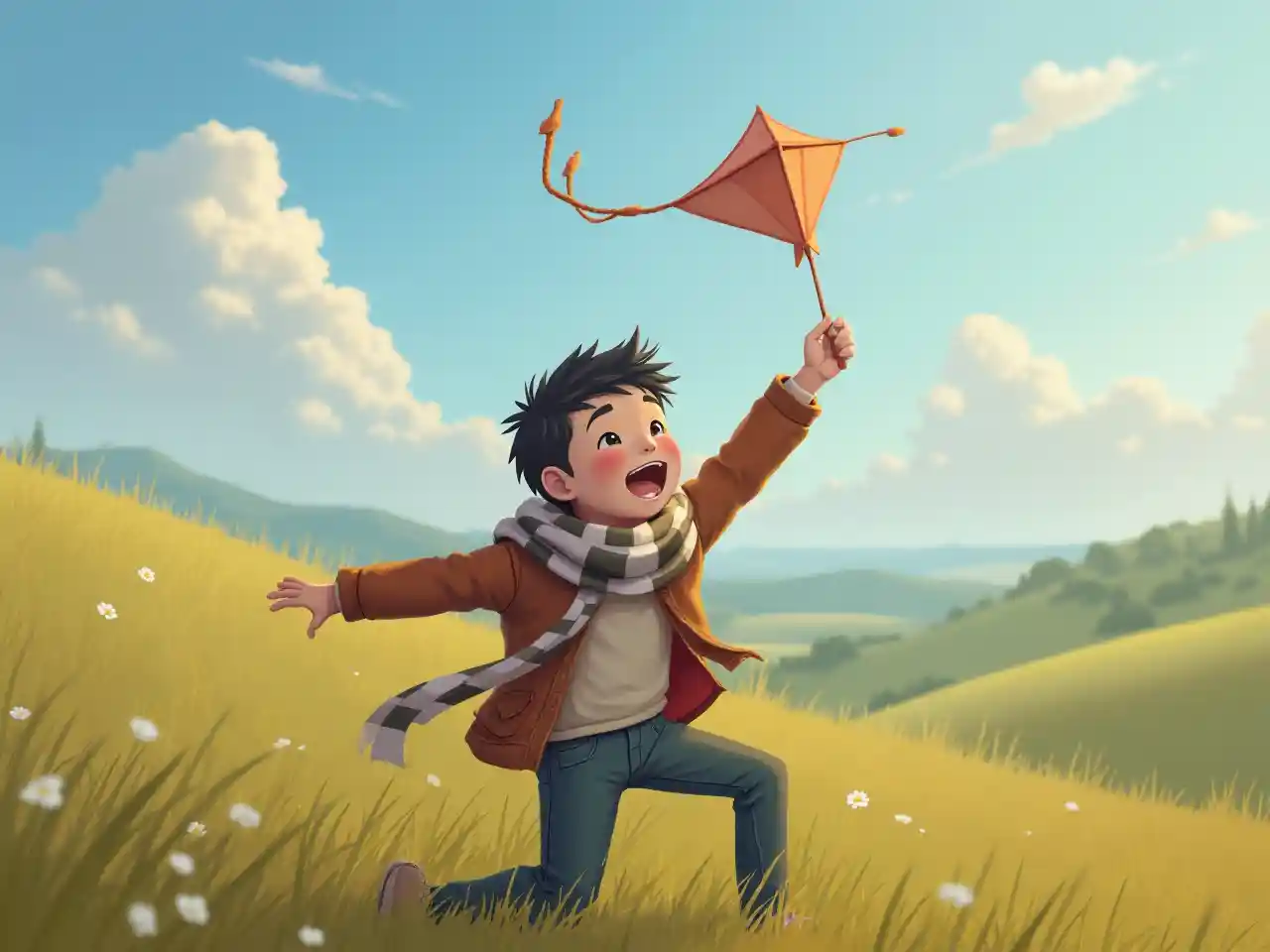Mvulana wa Asia mwenye umri wa miaka 6 mwenye nywele zenye miiba huruka kwa ndege wa angani juu ya kilima chenye upepo, akiwa amevaa koti la kivita na kofia ya cheki. Nyasi zenye kutiririka na mawingu yenye kuvutia humweka katika mazingira yenye kung'aa.