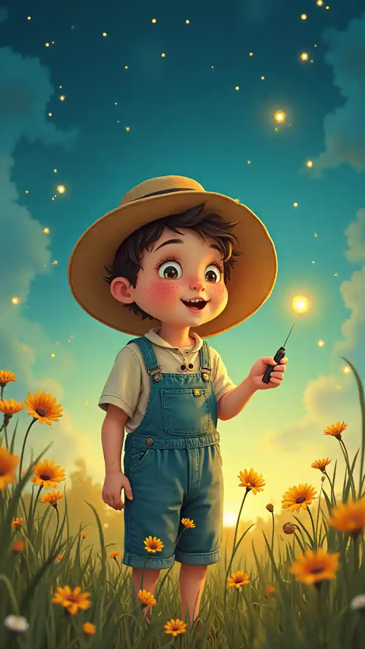 Mvulana mweupe mwenye umri wa miaka 5 mwenye madoadoa anawinda nondo kwenye nyanda, akiwa amevaa kofia ya nyasi na koti. Maua ya porini na anga lenye nyota humweka katika mazingira, na vipande vyake vyenye hamu ya kujua mambo hutoa habari za uaminifu na ajabu katika mazingira ya asili.