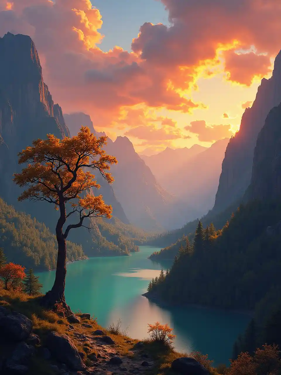 A breathtaking panoramic view of a hidden valley bathed in the golden light of sunset. Towering, moss-covered cliffs surround a crystal-clear turquoise lake. In the foreground, a lone, ancient tree with glowing leaves stands silhouetted against the vibrant sky filled with swirling clouds of orange, pink, and purple. The style should evoke a sense of awe and wonder, similar to the landscape paintings of Albert Bierstadt. Example 2 (Creative Writing):