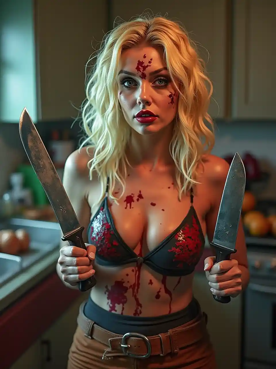 Britney Spears jikoni na visu 2 kubwa vya mchinjaji mikononi, mapambo ya fujo na nywele za fujo, mavazi ya Halloween, rangi za fujo, rangi za tofauti