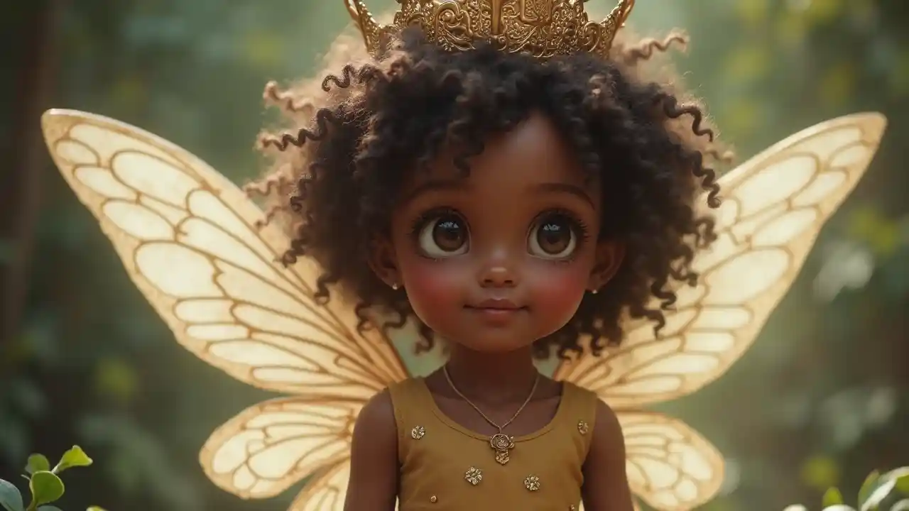 Tooth fairy, msichana mdogo, ngozi, macho makubwa na nywele curly, mabawa na taji