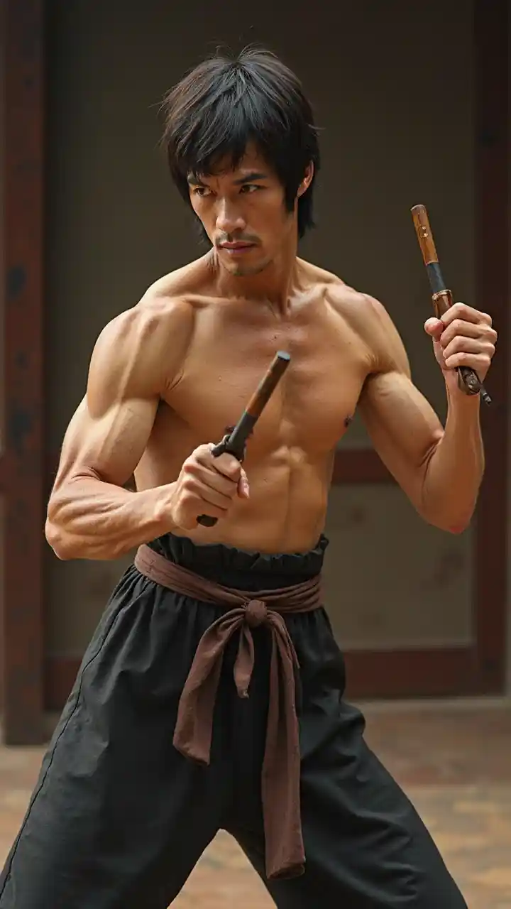 Bruce Lee Akiwa na Nunchaku Katika Hekalu la Shaolin