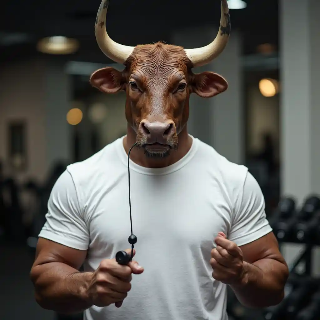 Ng'ombe kuangalia kama binadamu stylized kama kocha michezo na filim na nyeupe t-shirt katika mazoezi