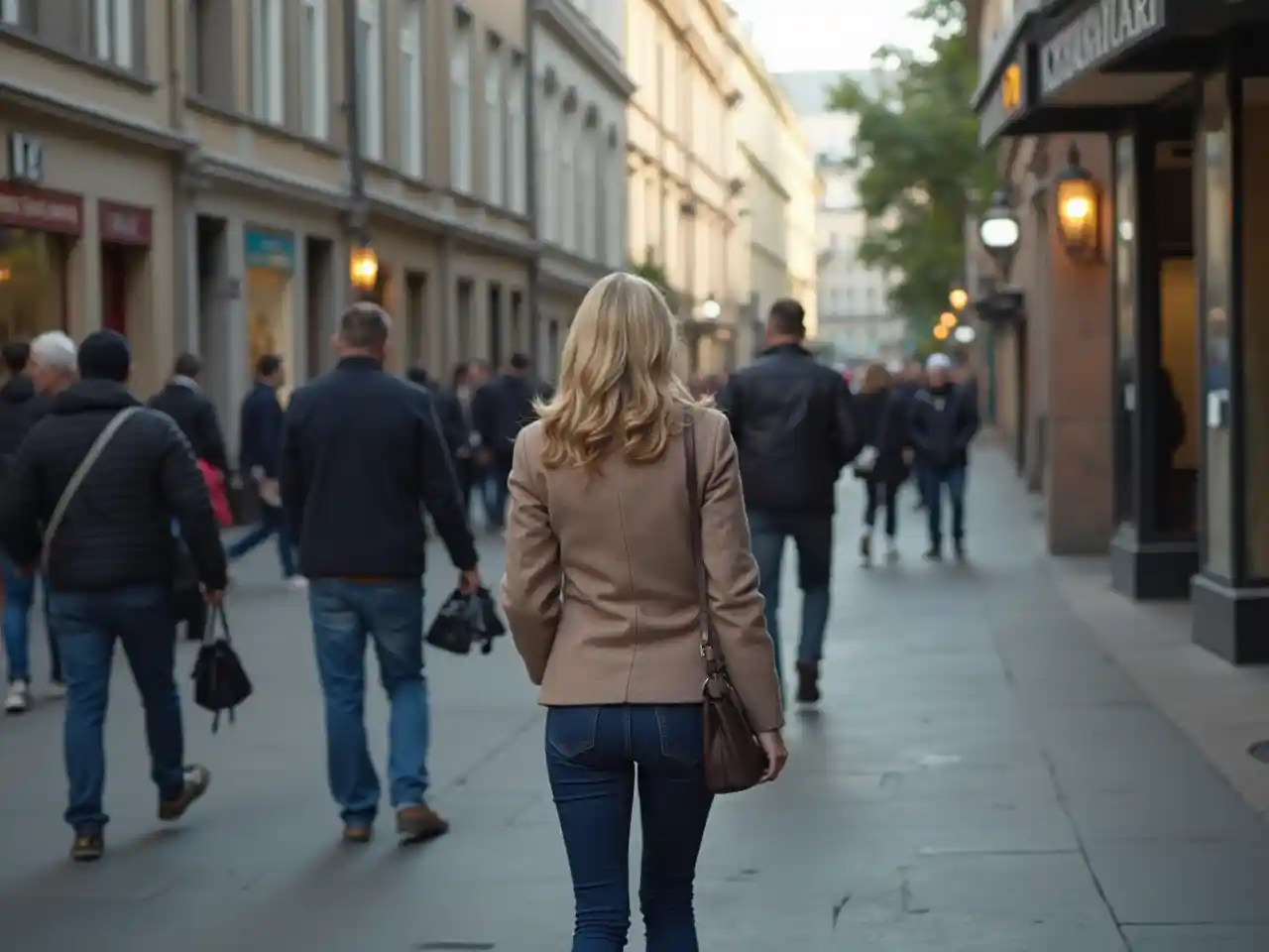 Mwanamke akitembea kando ya barabara yenye shughuli nyingi, kamera zinamfuata