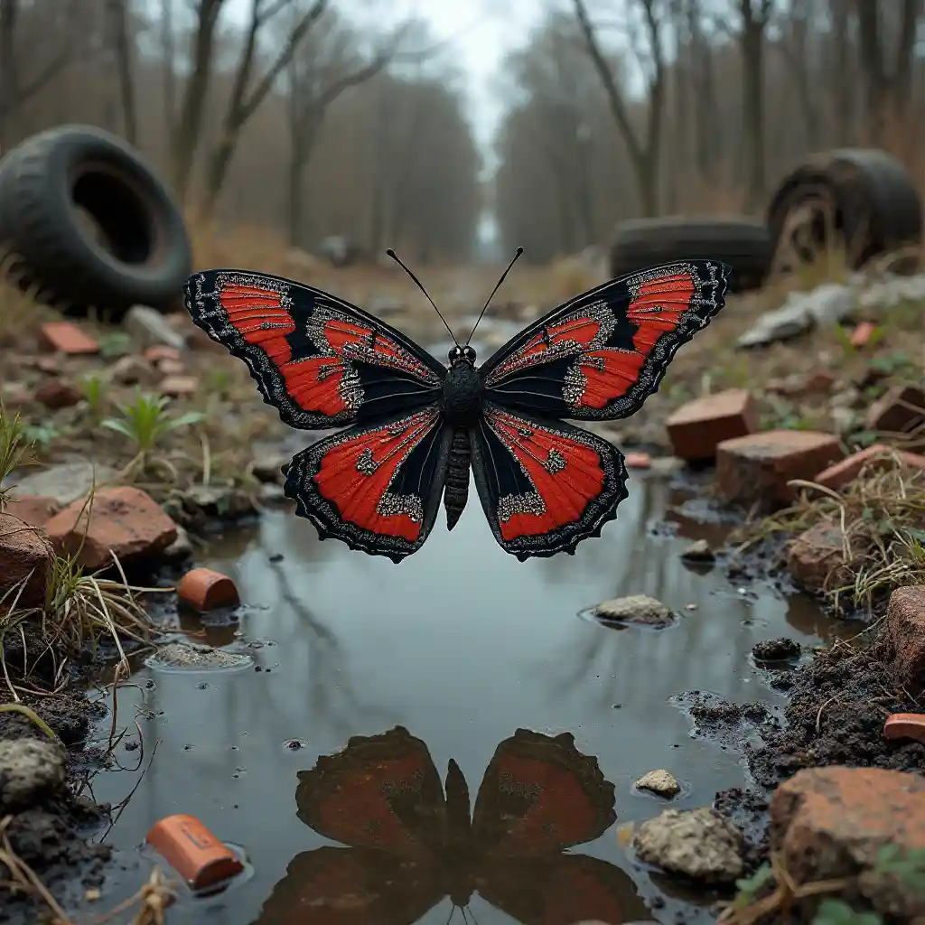 Kipepeo mwenye mabawa maridadi aliyepambwa kwa mitindo ya jadi ya Moldova, akikazia miundo yenye kufanana ya rangi nyeusi, nyekundu, na nyeupe. Inaruka juu ya kidimbwi cha maji yaliyoegemea kilichojaa takataka na madoa ya mafuta, katika uwanja uliotupwa uliojaa matofali yaliyovunjika, magurudumu ya zamani, na mimea iliyojaa, tofauti kubwa inayoonyesha kwamba uzuri hudumu
