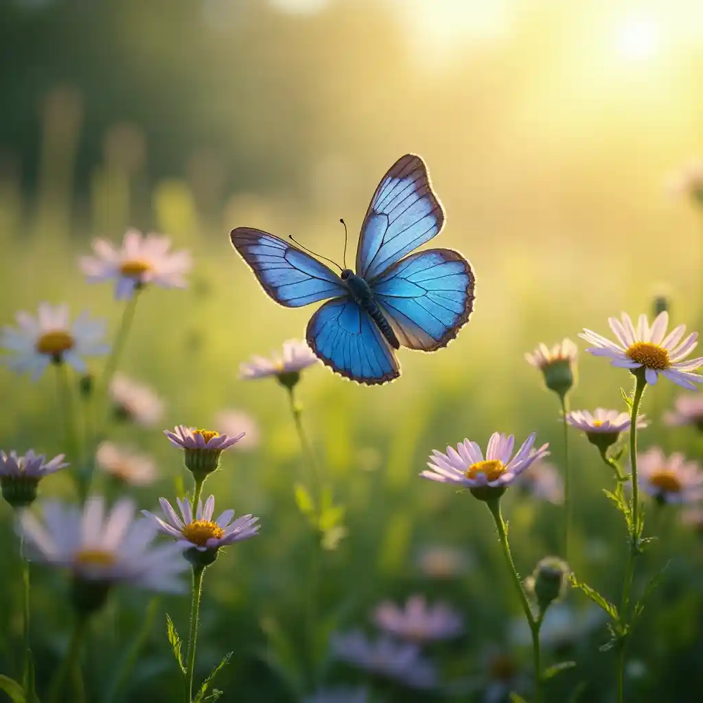 (kipepeo wa bluu mwenye nguvu), akiruka kwa uzuri katika shamba la maua ya porini, nuru ya asubuhi ya mapema ikitoa mwangaza wa kichawi, matone ya umande yaking'aa kama almasi kwenye vilemba, nyasi za kijani, anga iliyojaa utaratibu, (4K), jua la kina, laini linaanga eneo, hali ya utu na uzuri unafunika mandhari.