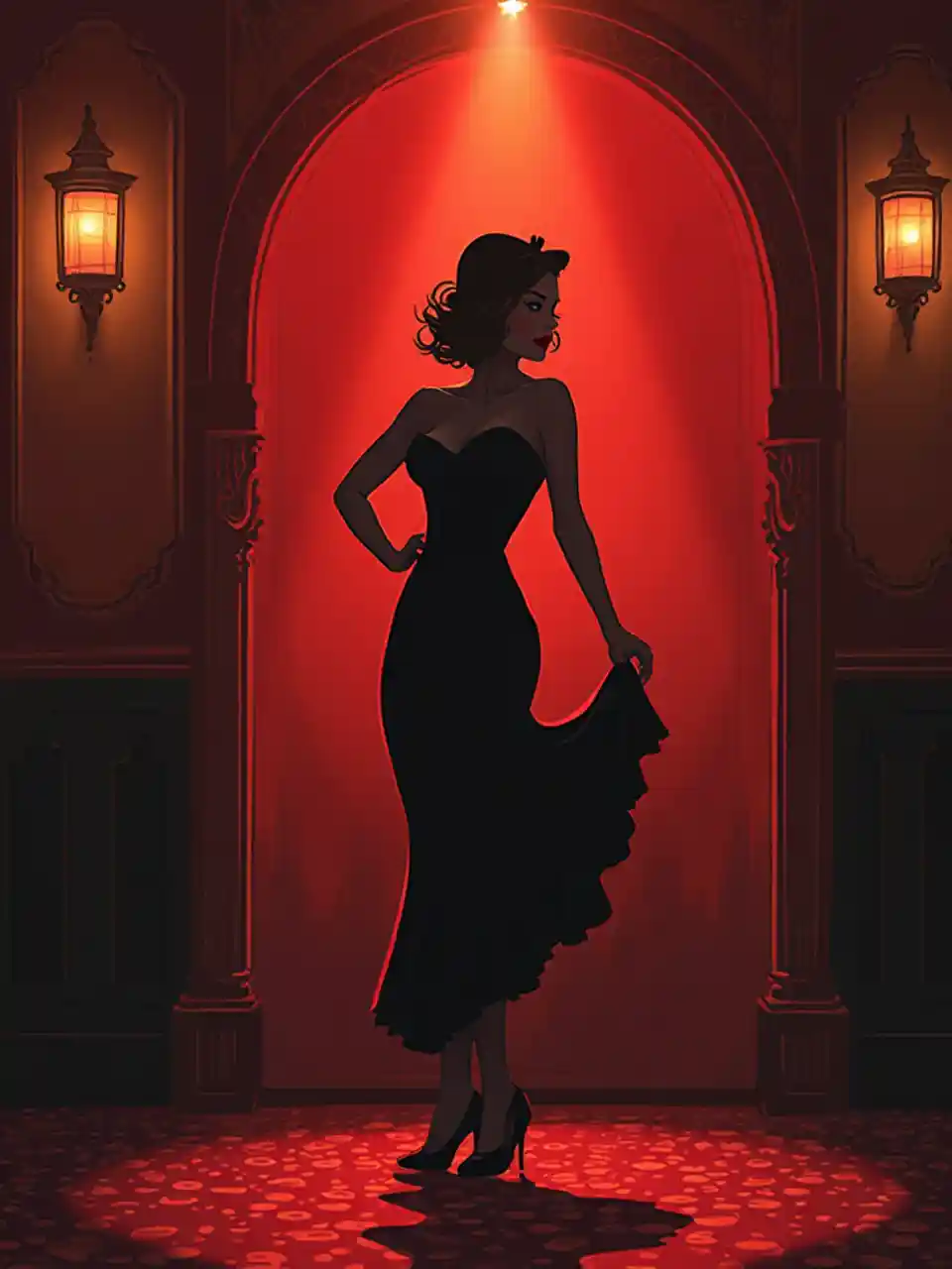Ningependa un'illustration senza testi sopra. Anga ya cabaret iliyoongozwa na muziki "Chicago", na silhouette ya kike katika nafasi ya ngono, imezungukwa na taa nyekundu na za dhahabu kama zile za miaka ya 50, na mazingira ya usiku na moshi.