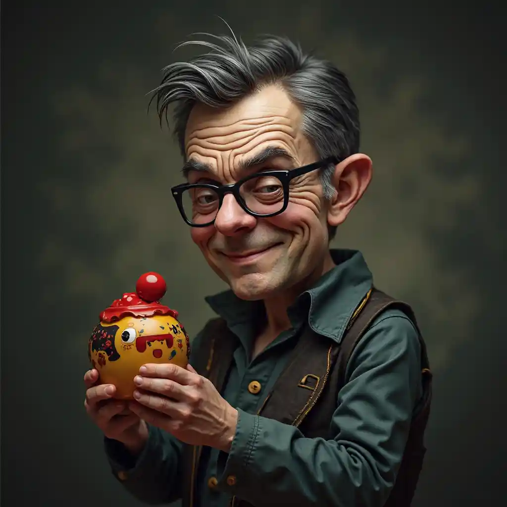 Mhalifu Mkanada, mwenye uso usiofaa, miwani ya kusoma, akishika kichezi cha watoto mikononi mwake