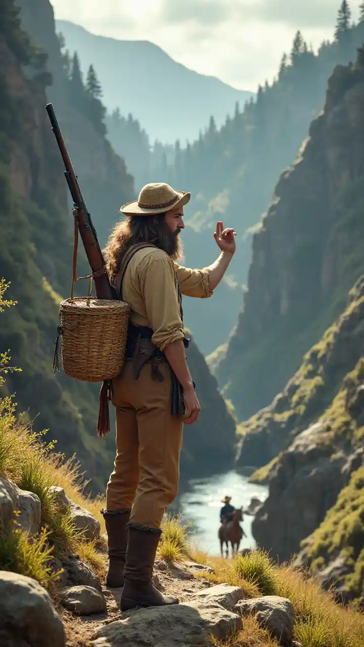 kuunda picha ya 1800s msafiri, kijana na nywele ndefu blonde na ndevu ambaye amevaa briefs rangi Native American moccasins, kikapu wicker juu ya mgongo wake na sufu ya uwindaji. yeye ana shingo ya bunduki yake na pipa juu ya ardhi. yeye anaangalia mbali ili wote unaweza kuona mgongo wake, huwezi kuona uso wake, na yeye winking kwa mtu mmoja mbali katika bonde, mbali sana kwamba unaweza kuona nyuso zao, wao ni chini katika chini ya bonde, na wote wana muda nyeusi nywele na wao ni kila juu ya farasi mmoja. eneo ni katika bonde kubwa kuja na Douglas na ponderosa miti na mto unaendelea.