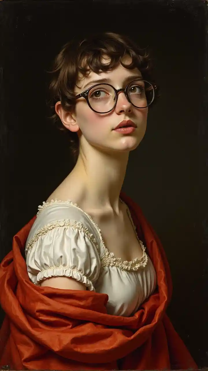 JacobMchoro wa Caravaggio wa mwanamke mrembo mwenye nywele fupi, aliyevaa miwani, na kifuniko chekundu