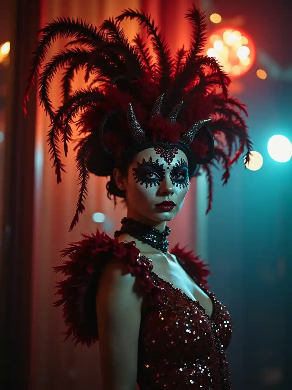 LaylaKarnevali; mwanamke harlequin tabia; chama mazingira katika ukumbi wa kisasa ukumbi, taa, manyoya