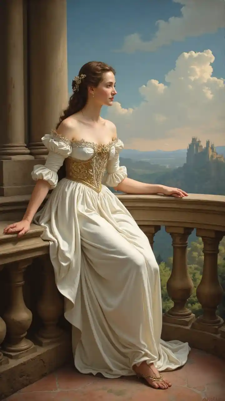 AuroraPicha ya Annibale Carracci. Princess katika kanzu nyeupe ameketi juu ya balcony ngome.