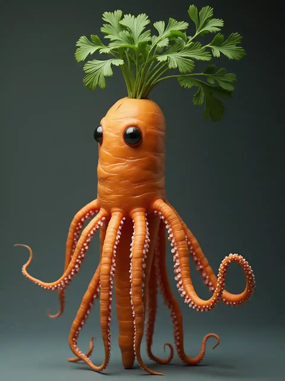 Mchanganyiko wa ajabu wa wanyama wa karoti na pweza. Mkia wa karoti ni pweza.