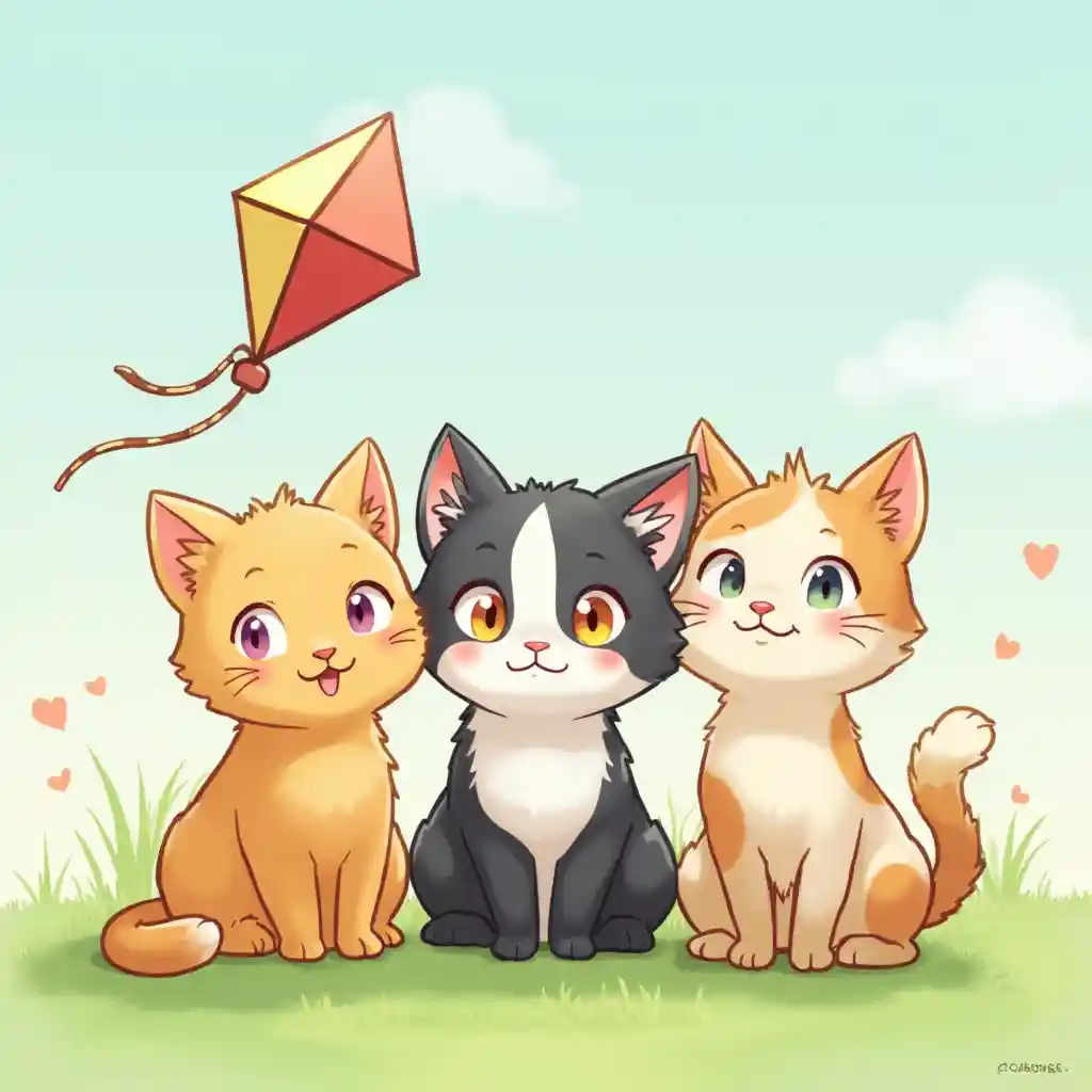 Paka watatu wa katuni, mmoja wa rangi ya machungwa, mmoja mweusi na mweupe, na mmoja wa rangi ya kijani, wameketi kwenye nyasi kando ya upepeo wenye rangi ya kijani.