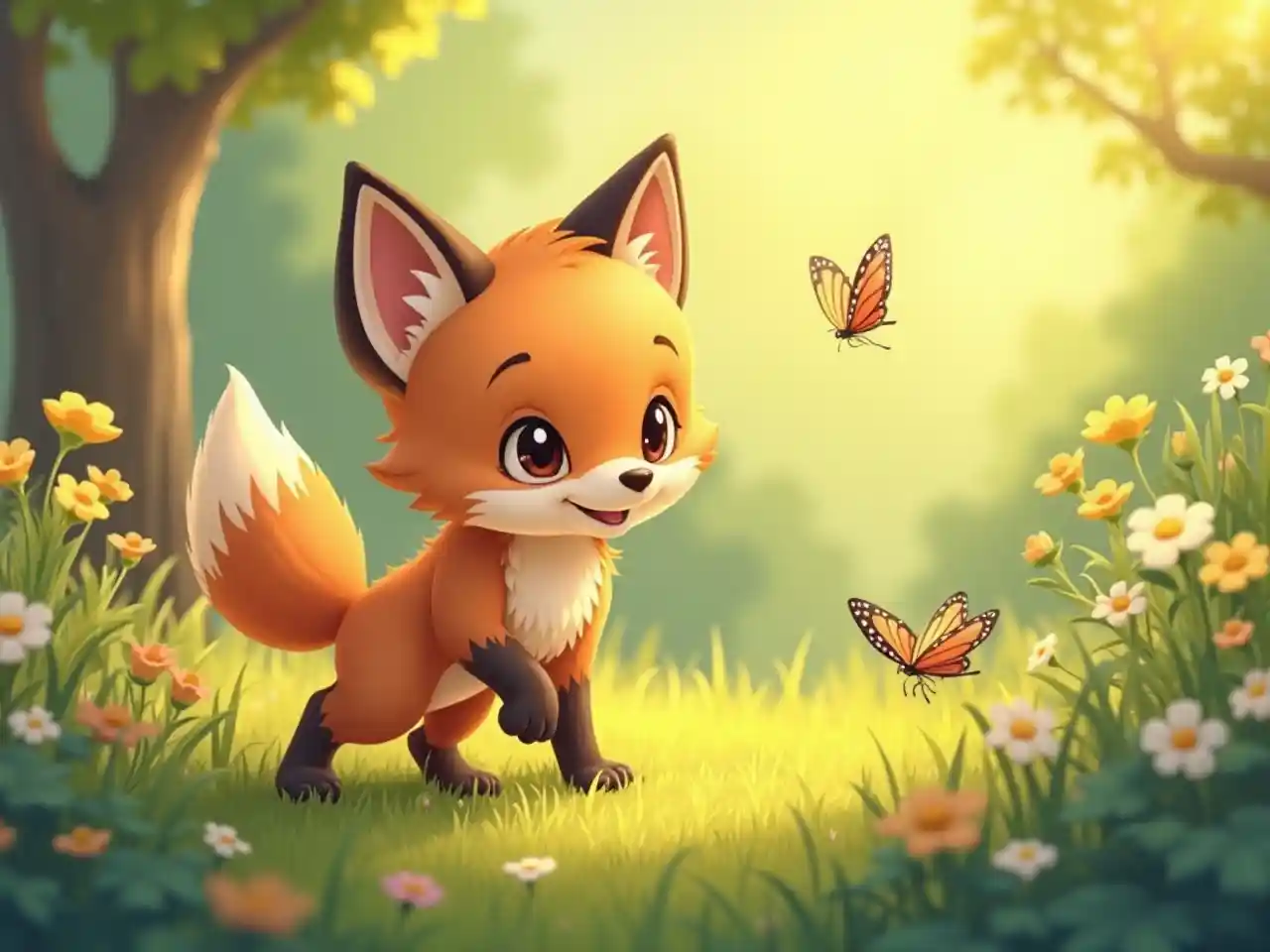 ScarlettKujenga cute cartoon Fox cub kuendesha gari kipepeo katika bustani katika mwanga wa asubuhi
