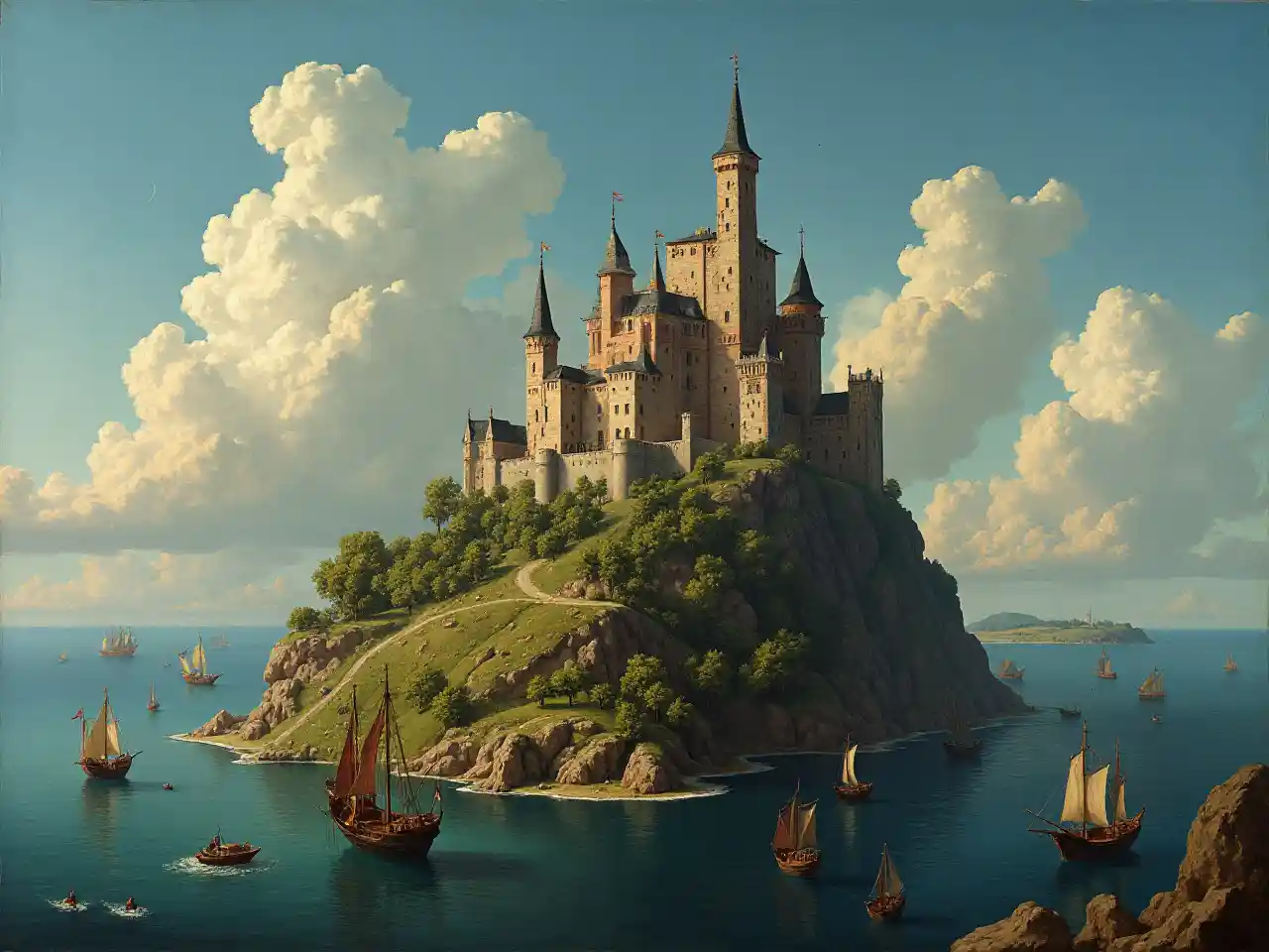 ngome ambayo inasimama juu ya kisiwa, karibu na kisiwa kuna bahari ambayo boti na mtindo wa Hieronymus Bosch