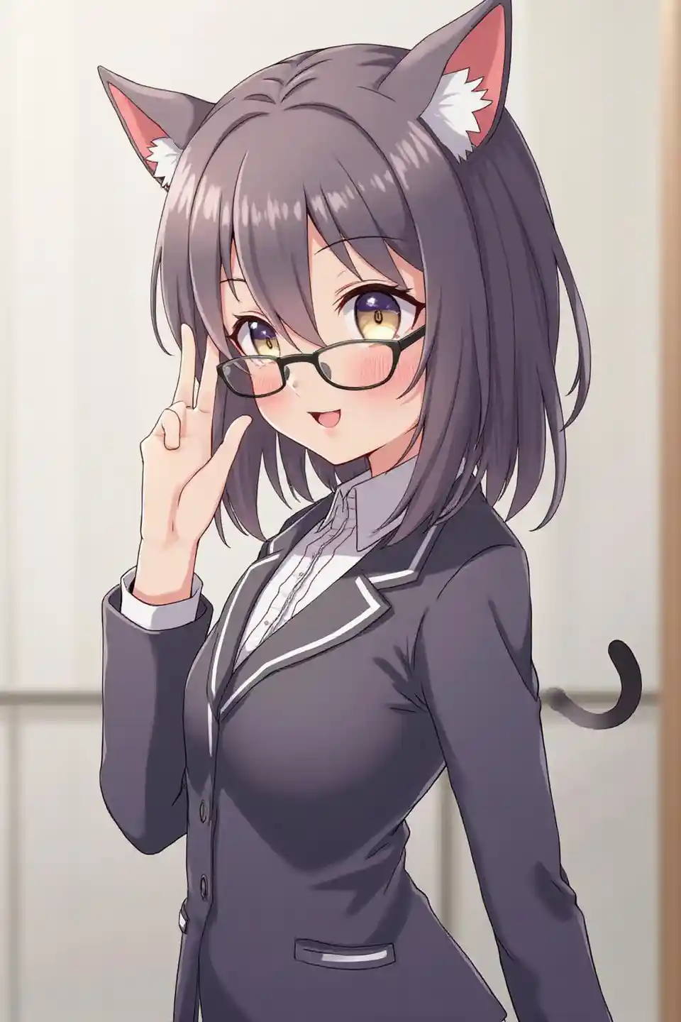 (kiongozi,ubora bora), msichana na masikio ya paka, nzuri sana, kiakili, miwani Wellington, mavazi rasmi, juu ya mwili, watazamaji, kidogo juu