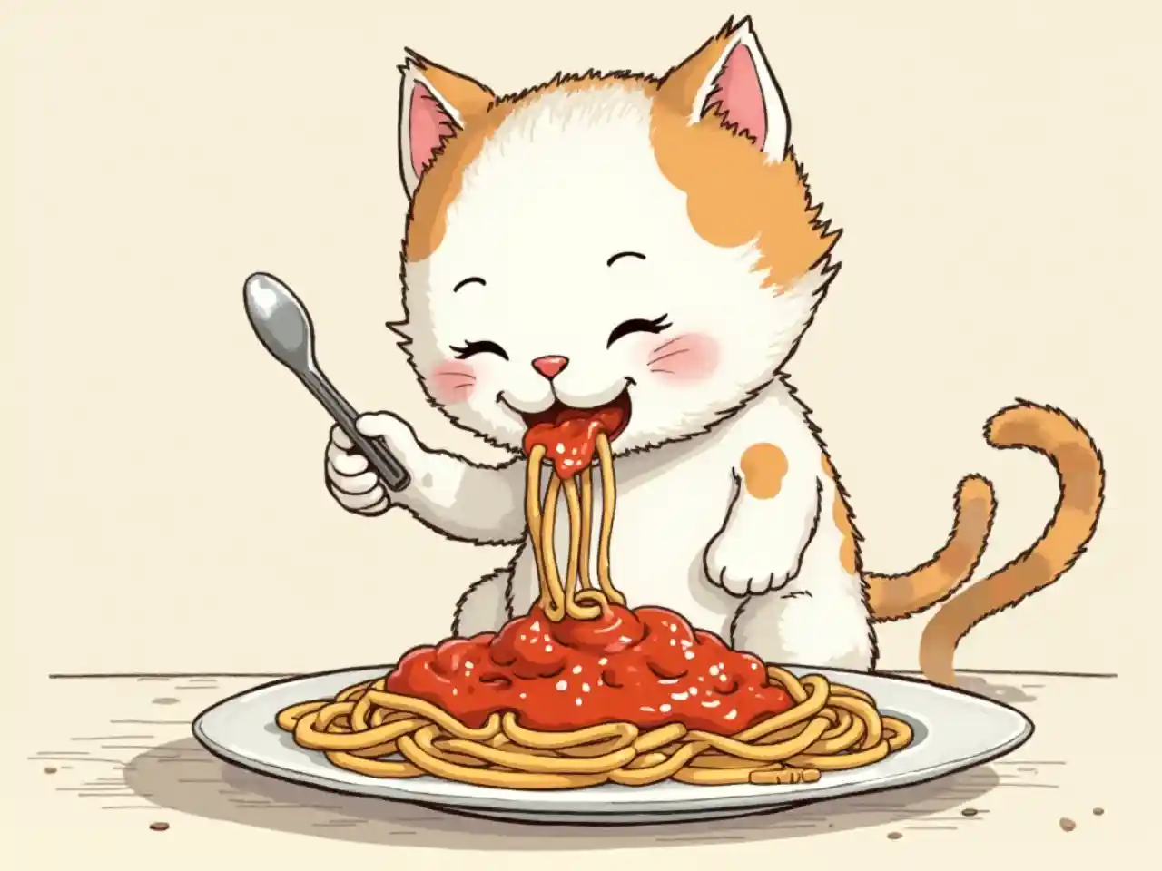 Paka mweupe mwenye madoa ya kahawia akila spageti yenye mchuzi wa nyanya, picha na Hergé, rangi kamili