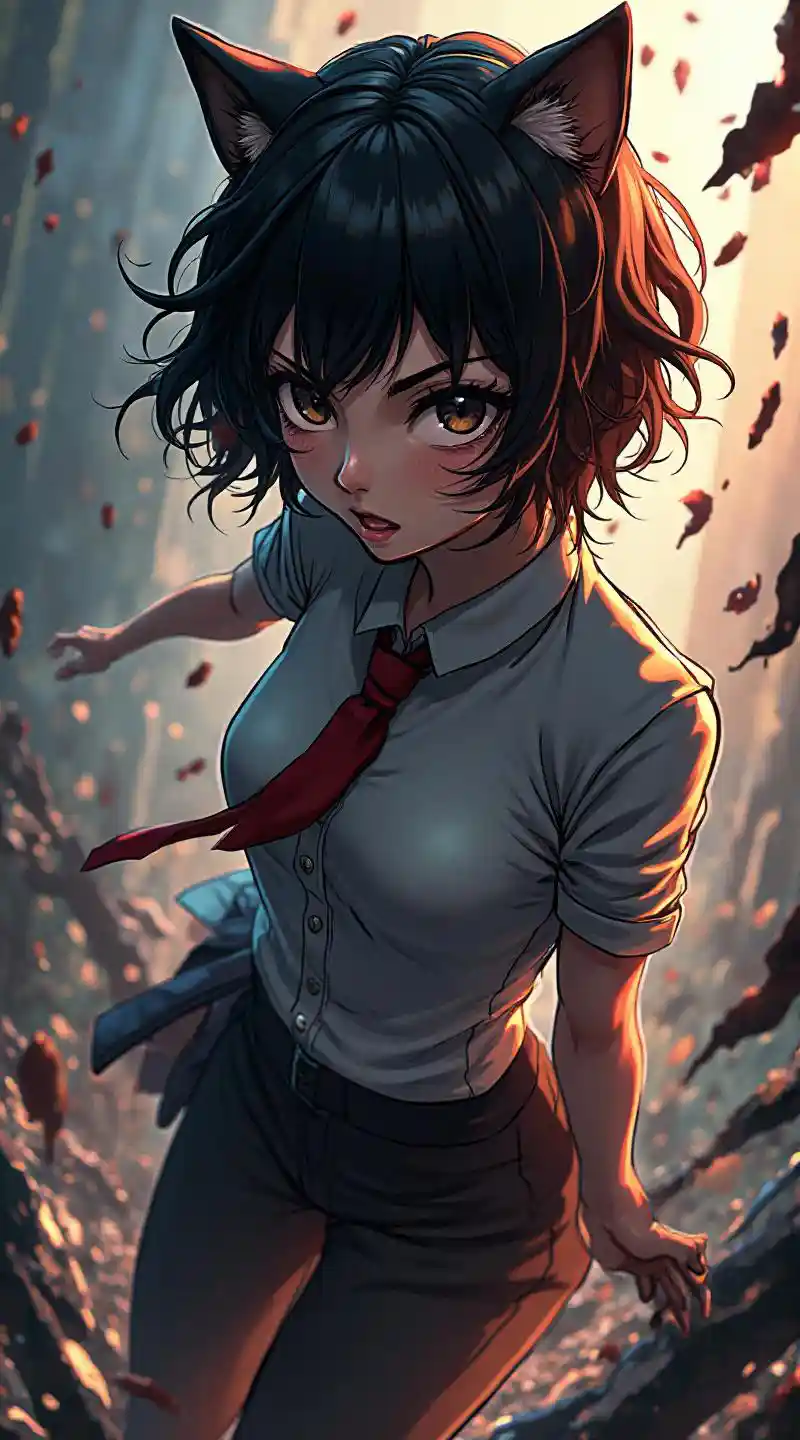 Harpermasterpiece, ubora bora, ultra-unaelezwa, nguvu manga style, cinematic angle, dramatic lighting. Catgirl agile na nywele fupi nyeusi, kali