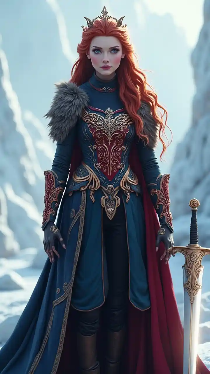 (Anna kutoka Frozen), (nywele ndefu nyekundu), amevaa kivuli tata Celtic embroidered nyekundu na bluu futuristic cybernetic silaha ambayo shimmer na maelezo tata, pambo na mtiririko mrefu nyeusi na dhahabu kanzu ambayo elegantly trails nyuma yake. Taji yenye kung'aa inaweka juu ya kichwa chake, ikionyesha mwangaza wa hali ya juu. Upanga unaong'aa mkononi mwake umeelekezwa mbele. Mahali pa nyuma pana mandhari ya kijivu chini ya anga angavu. Maelezo ya kina sana, ubora wa 4K, hali ya sinema.