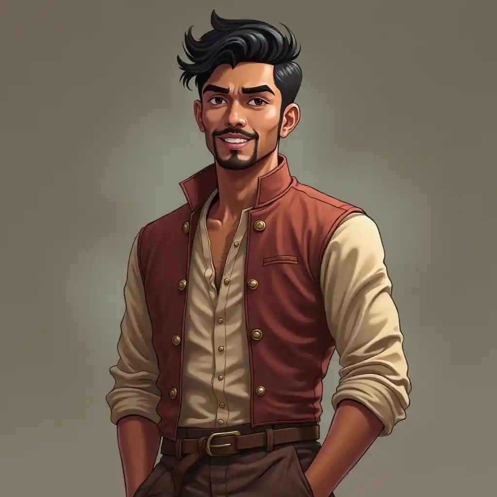 Unda tabia ya kiume ya India yenye nguvu ambayo inaonyesha uongozi, ujasiri, na mchanganyiko wa maadili ya jadi na ya kisasa. Anapaswa kuwa na sura nzuri, na mdomo wenye nguvu, macho yenye kuvutia, na tabasamu yenye furaha. Utu wake ni mchanganyiko wa akili, ucheshi, na umaridadi, na hivyo anakubalika sana. Ana ujuzi wa Bollywood, kriketi, au muziki, na ana uwepo mkubwa wa kijamii. Afanye mavazi yake yawe mchanganyiko wa mavazi ya Kihindi na mitindo ya kisasa. Fanya sura na umbo lake lionekane kuwa halisi, na kuhakikisha kwamba ana sura ya kawaida, ngozi yake ni halisi, na mavazi yake na umbo lake ni halisi.