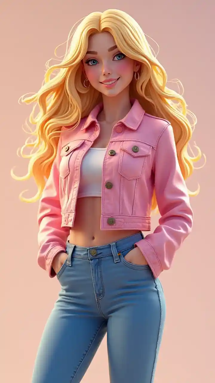 Mwanamke wa Marekani wa kupendeza na nywele za dhahabu zinazoendelea amevaa koti la denim la rangi ya waridi, jeans iliyo na rangi ya bluu, iliyoundwa katika 3D, azimio la juu 8k, iliyofanywa na injini isiyo ya kweli, uwiano wa picha 9:16, iliyo na rangi zenye nguvu na mtindo wa nguvu, marekebisho madogo kwa undani ulioimarishwa, kudumisha kiini cha uandishi na kipaji cha sanaa.