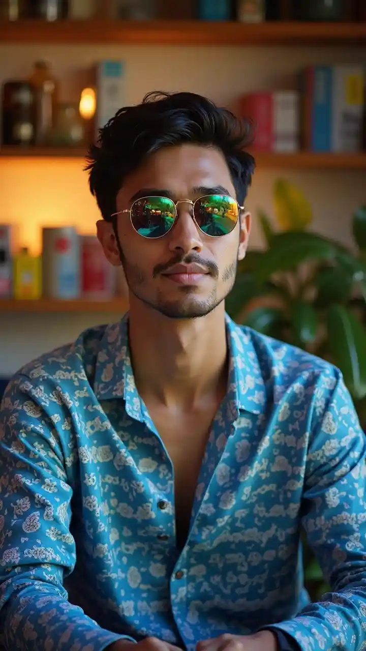 Mume akiwa na miwani ya jua ya mviringo yenye kupendeza ambayo huonyesha mandhari yenye rangi nyingi, ameketi kwa utulivu katika mazingira ya ndani, akitoa kivutio cha utu. Nywele zake nyeusi, zenye kupambwa vizuri, zinakamilisha shati lenye mitindo yenye kupendeza katika rangi za bluu na nyeupe, zikitokeza tabia yake ya utulivu. Nyuma yake, rafu iliyoangazwa kwa upole inaonyesha vitu mbalimbali, kutia ndani chupa na masanduku, ikionyesha mazingira yenye utaratibu na yenye utu. Mwangaza katika chumba huongeza mwangaza wa joto, na kuunda mazingira yenye kuvutia ambayo humwalika mtazamaji ashiriki katika wakati wake wa starehe. Kwa ujumla, watu wanajiamini na wanafurahia maisha ya kawaida.