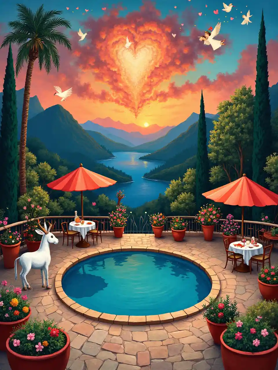 (Marc Chagall awali, surreal style uchoraji), kadi ya Siku ya wapendanao, enchanting na charming jiwe nje mgahawa wa Mexico, meza umbrella, jioni kubwa ya mviringo bwawa, kuzungukwa na mimea ya potani yenye nguvu na maua, milima na ziwa nyuma, sherehe ya kimapenzi ya Siku ya Wapendanao, mioyo ya ajabu na malaika wa kucheza, wapenzi wanacheza dansi angani, anga ya kichawi, mitende na miberoshi, baridi, laini rangi, taa zinang'aa, anga ya jua, malaika mbinguni, mazingira ya ndoto, kina sana, mandhari ya kuvutia, mazingira ya kimapenzi.