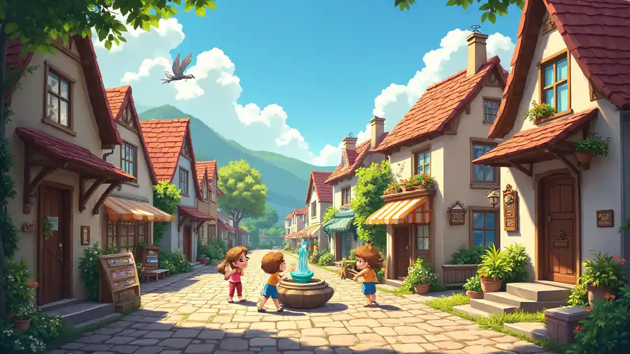 Mji mdogo wenye kupendeza wenye barabara zenye mawe, nyumba za kifahari, na anga ya bluu. Jua huangaza kwa joto, na ndege huimba watoto wanapocheza karibu na chemchemi ndogo. Maduka yanajipanga kwenye barabara, kutia ndani duka la kuokea mikate lenye ishara ya mbao na ofisi ya posta yenye barua zilizowekwa vizuri. Jiji hilo linaonekana kuwa lenye joto, ukaribishaji, na msisimko.