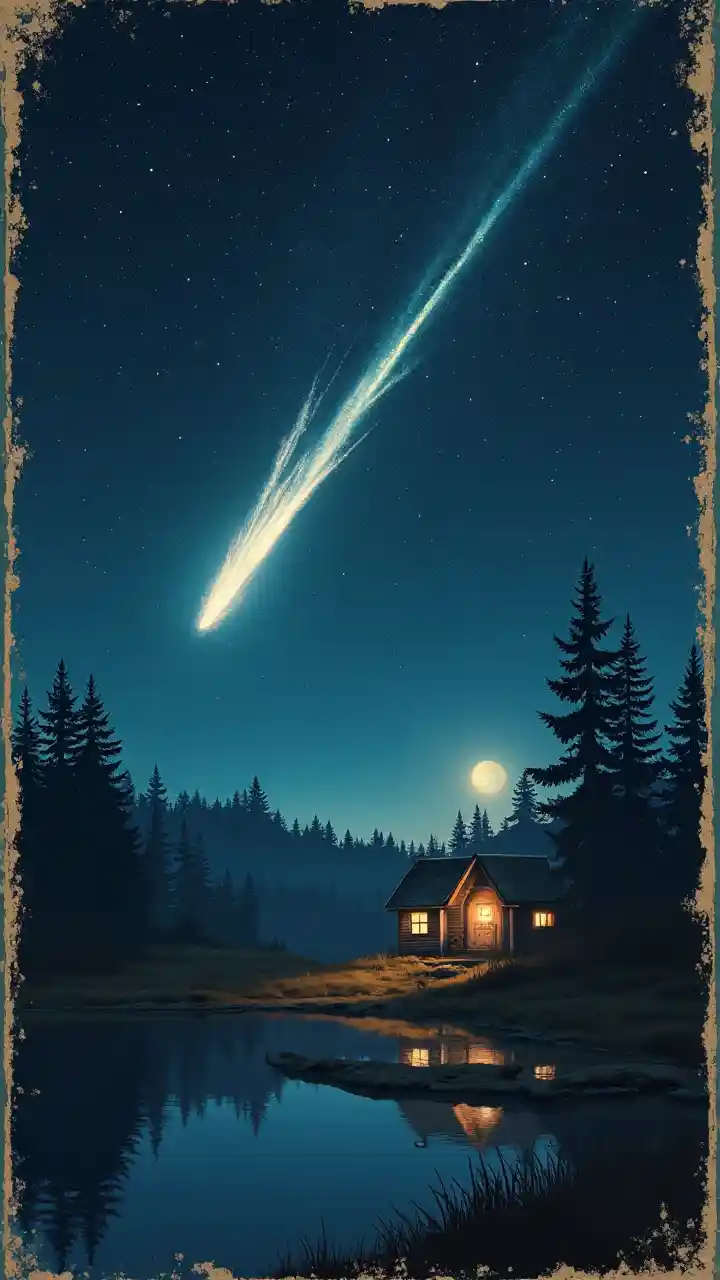 Vintage style filamu poster kwa "Kukimbilia vivuli", akishiriki usiku anga kujazwa na nyota kama background. Kwenye kilele, kuna ziwa lenye nuru ya mwezi, likirejezea usiku wenye nyota. Kwenye ukingo wa ziwa, kuna nyumba ya zamani, yenye mwangaza wa ndani. Picha hiyo inaonyesha tukio fulani la angani, yaani, nyota inayowaka moto, au mpira wa moto, ukipiga mwendo angani na kukamata wakati ambapo nyota hizo zilianguka.